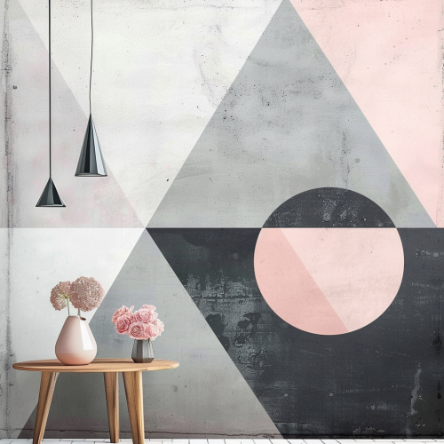 Design a striking minimalist abstract artwork that uses soft, muted tones of blush pink, warm terracotta, cream, and deep grey. Incorporate geometric shapes like arches and angular forms that create a sense of depth and perspective through the interplay of light and shadow. The composition should evoke calmness and balance, with a clean, modern aesthetic. Focus on subtle texture and tonal gradation to create a harmonious yet dynamic visual experience, perfect for contemporary interior spaces. --ar 2:3