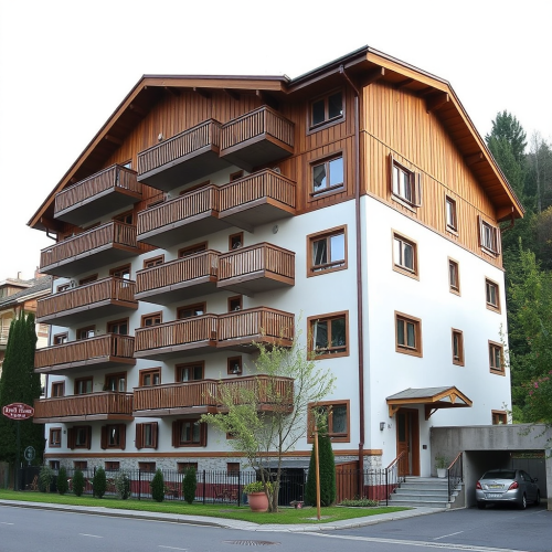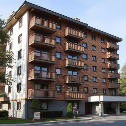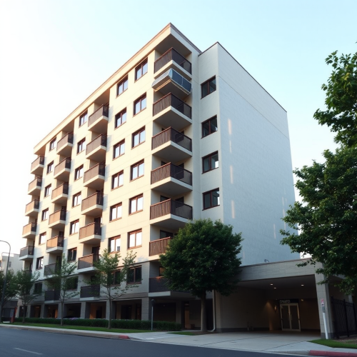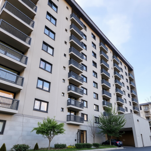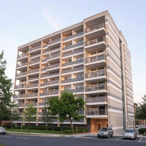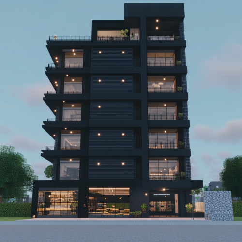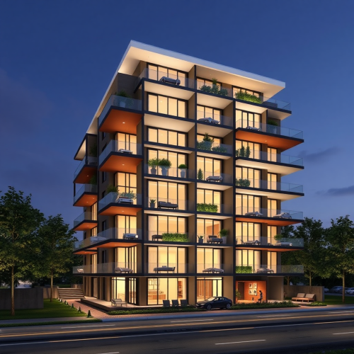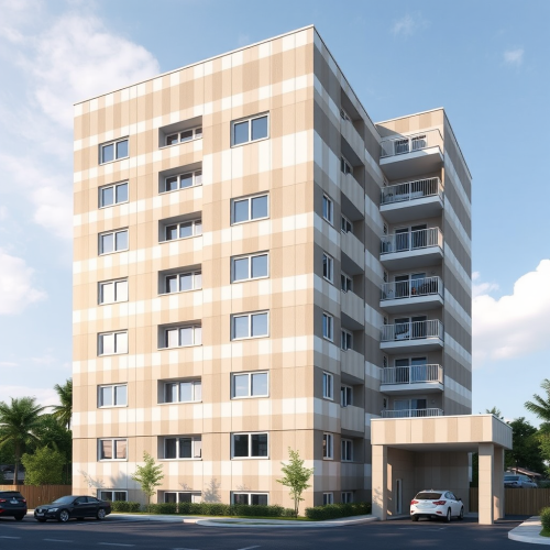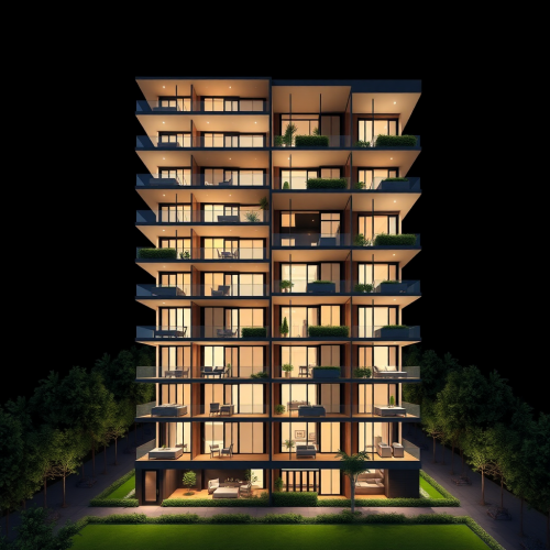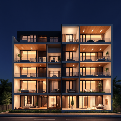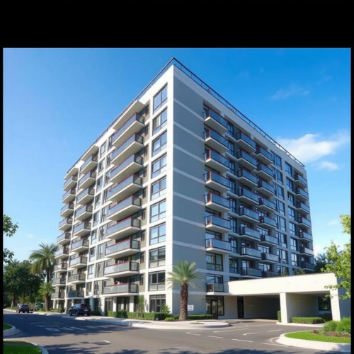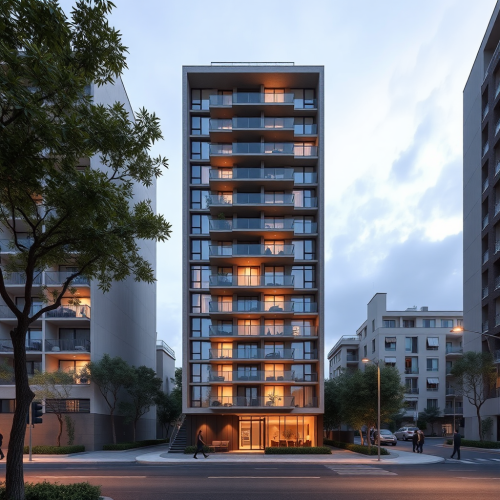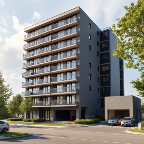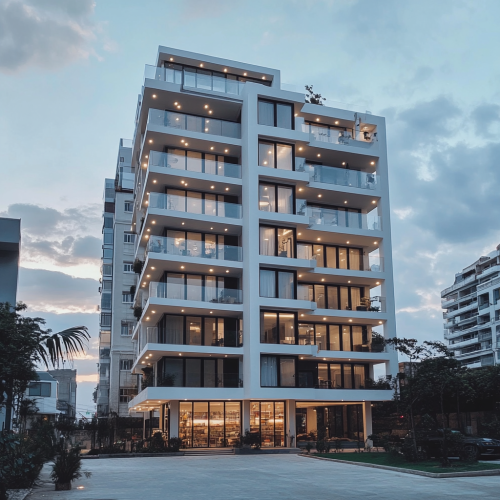 8 story 15m vide building as seen from the street front, the two top floors are an offset penthouse with 360 views, ground floor is 1 1/2 story high market and park it has a car ramp to access the basement, the middle floors are all apartments with balconies. Everything is white.