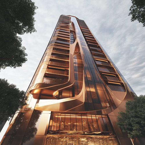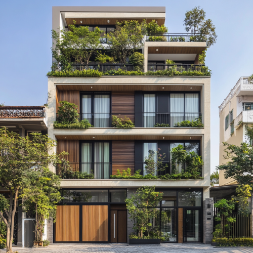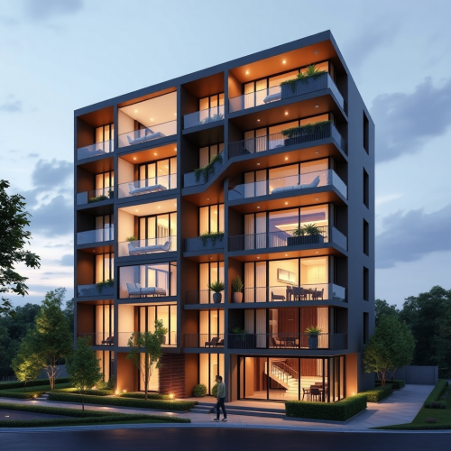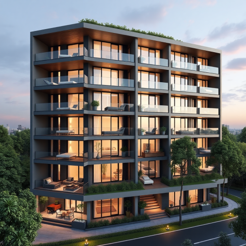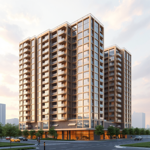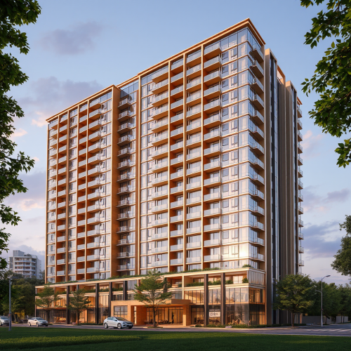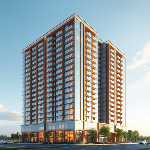 architectural facade design for G+15 FLOOR inspired from modern building and farme work on it with balconies in front .color palette grey white beige blackj.louver in facade
