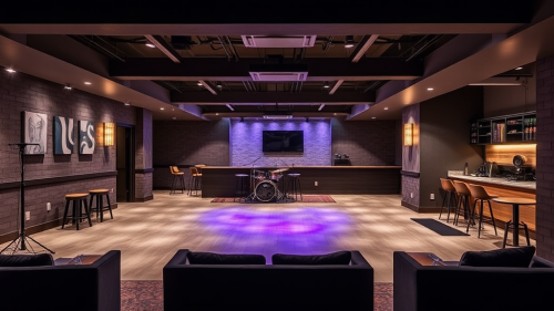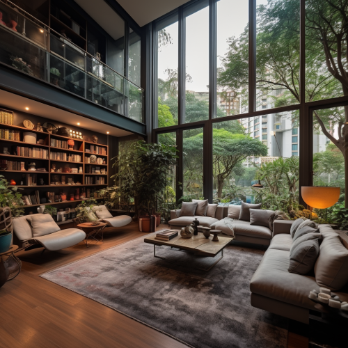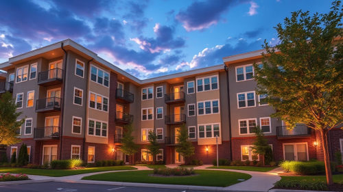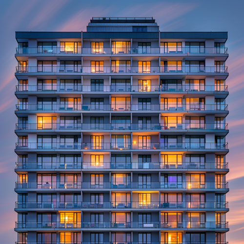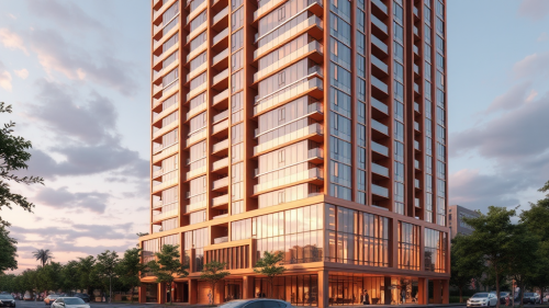 a 19 storey highrise apartment complex with central podium on first floor, Architecture photography, twilight sky, Late evening, highly detailed, golden ratio, 4k.