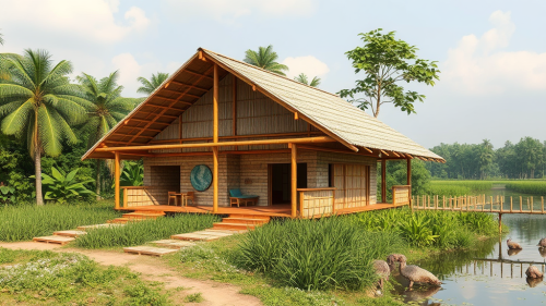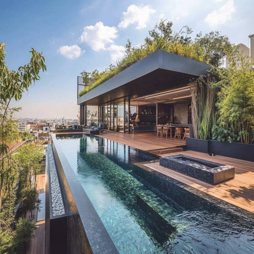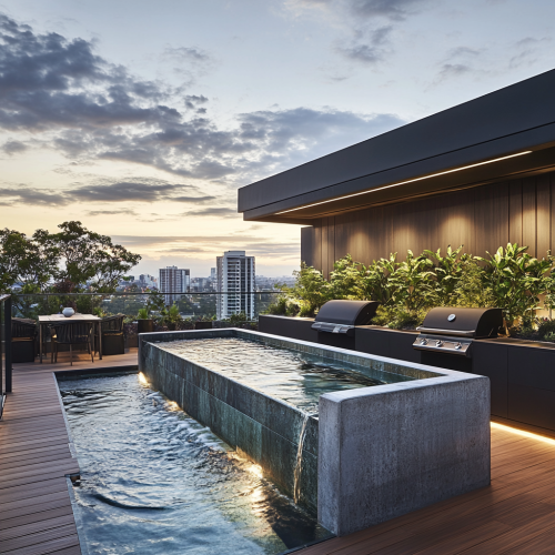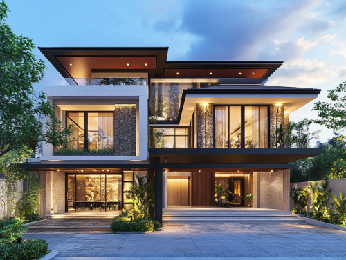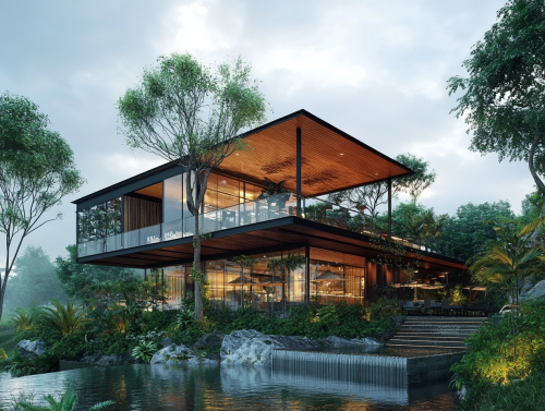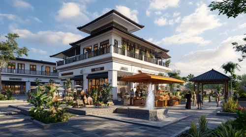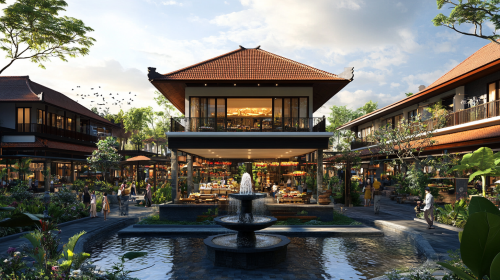 an architectural 3 storey modern retail building, balcony on top floor, focus on terrace walkway, modern bali inspired landscape, food stall in middle way, with a lot of visitors, fountain in middle hd photorealistic --ar 16:9 --v 6.1