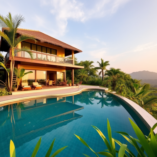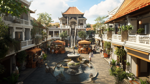an architectural photography 3 storey retail building with modern bali architecture, balcony on top floor, focus on terrace walkway, modern bali inspired landscape, food stall in middle way, with a lot of visitors, fountain in middle hd photorealistic --ar 16:9 --v 6.1