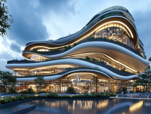 3 storey retail mall building modern design, balinese landscape, focus main concourse entrance, restaurant luxury on ground floor hd photorealistic, --ar 4:3 --v 6.1