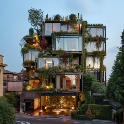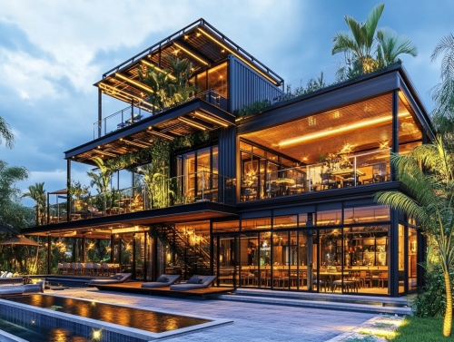 3 storey retail building in container design modern, balinese landscape, focus main concourse entrance, restaurant luxury on ground floor hd photorealistic, --ar 4:3 --v 6.1
