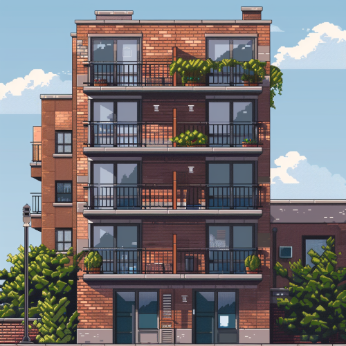 In pixelart an apartment building without anything else, without decoration front view in the Boston style of 5 floors with two balconies per floor with windows and doors to go onto the blacon