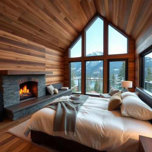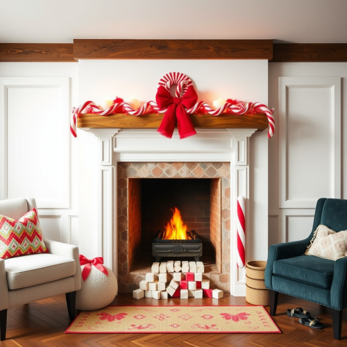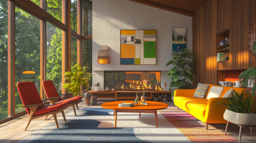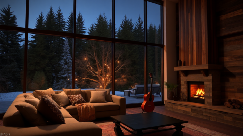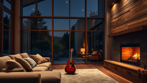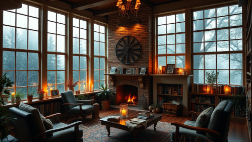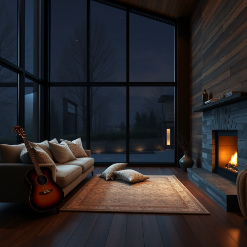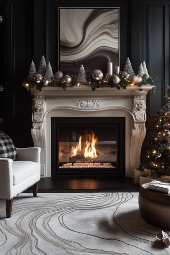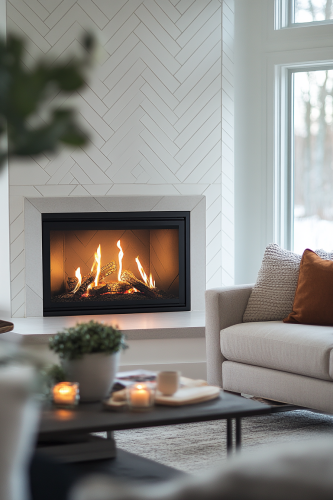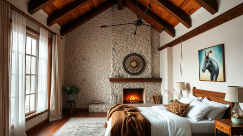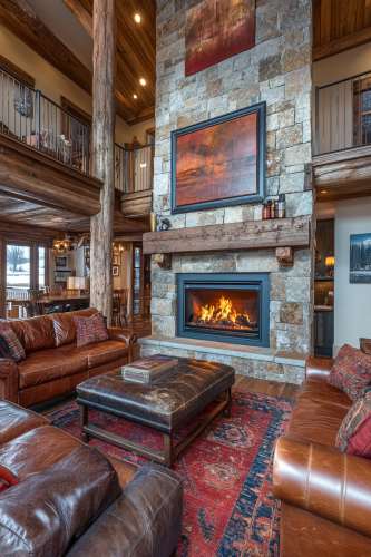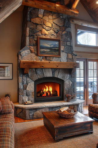 Showcase a transitional farmhouse fireplace that marries traditional charm with modern design elements. This fireplace might feature a classic brick or stone surround updated with a modern, sleek mantel. The decor should be a blend of old and new, such as placing contemporary art above a rustic stone facade. Capture this blend in a way that the transitional style is evident, appealing to viewers who appreciate both past and present design influences. This photograph should be so beautifully balanced that it compels viewers to click for more transitional fireplace designs. Camera: DSLR - Canon EOS 5D Mark IV. Lens: Canon EF 24-70mm f/2.8L II USM. Composition: Wide shot, room-centered, horizontal orientation, balance between furniture and space. Film: Digital, high resolution, color profile sRGB. Camera settings: ISO 400, f/2.8, 1/60 sec. --ar 2:3 --v 6.1 --s 250