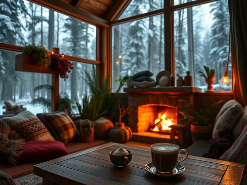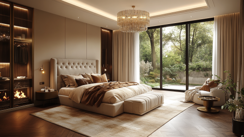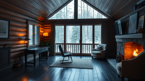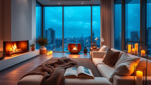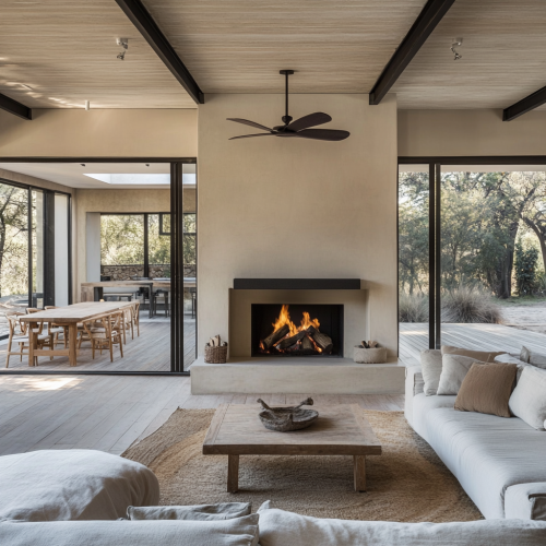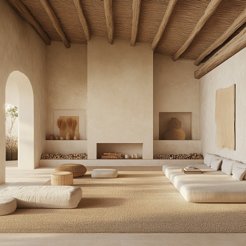Photorealistic hd resolution image of a large sitting room in a modern villa in Maiorca. Walls and floor are in cream resin with some carpets in sisal natural colour. There is a high ceiling with some bleached wooden beams. On the walls there are some modern minimal appliques. In one of the walls there are some niches with art objects and art books.There are modern sofas in natural linen fabrics. In front of the sofas there is a fireplace