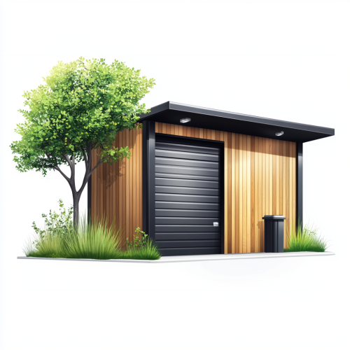 Design a realistic and professional logo for an outdoor storage shed business, featuring a 3D-style storage shed that looks like it's built from real materials like wood or metal. The shed should have a sleek, modern design with sharp lines, and be set against a clean, white background. Incorporate realistic garden elements, such as grass or a tree, to give it an outdoor feel. The colors should be earthy, with shades of green, brown, and grey, to reflect a connection with nature. The text of the business name should be in bold, modern font, positioned below or next to the shed icon, making the whole logo feel solid and trustworthy