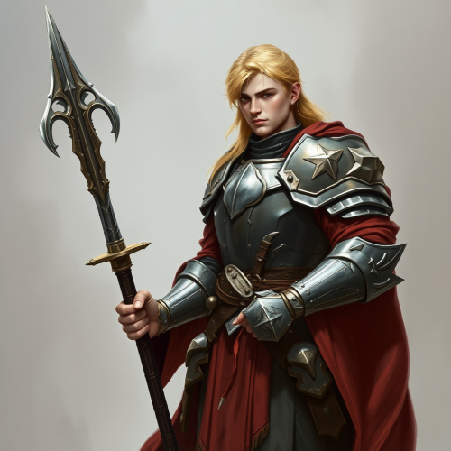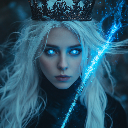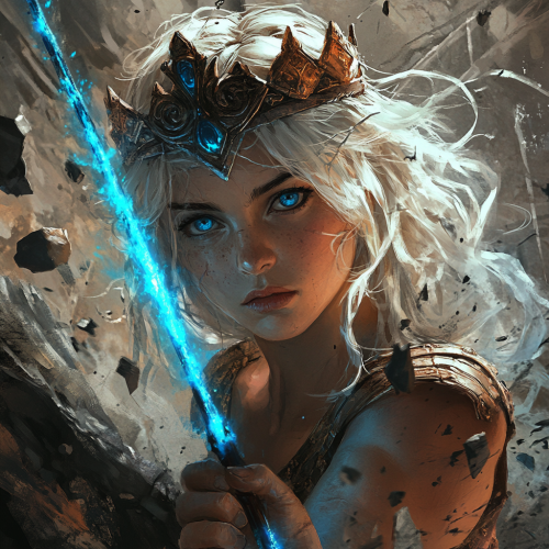 Valkry has white hair and blue eyes. She wears a Roman crown on her head Amidst the wreckage and in her hand is a stick from which blue rays come out. It strikes the ground and splits with a blue beam, splits a rock, and black perfume comes out of it.