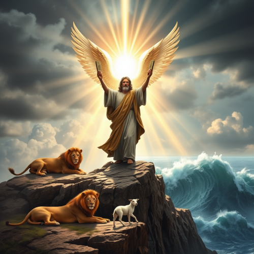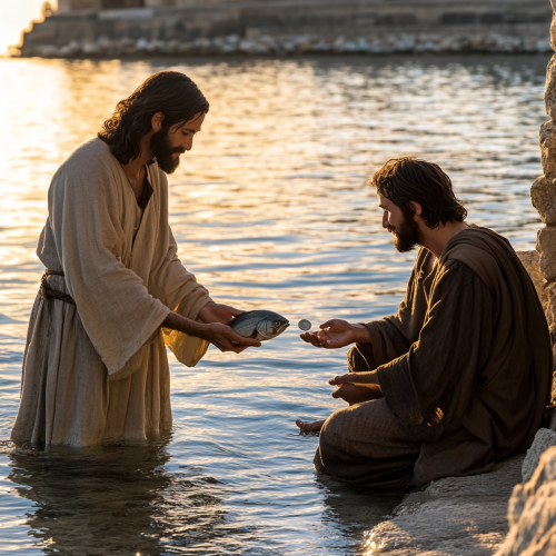 Capture a cinematic 9:16 image of the moment when Jesus performs the miracle to pay the temple tax. Jesus stands by the shore, calmly instructing Peter to catch a fish. Peter, kneeling at the edge of the water, holds a fish with a coin visible in its mouth, amazed by the miracle. Jesus is shown in a peaceful, authoritative stance, his gaze focused on Peter with kindness and wisdom. The scene is bathed in natural, golden light from the setting sun, reflecting off the water, creating a serene atmosphere. Use the perspective as if shot with a Nikon D850 camera and a Nikon AF-s NIKKOR 70-220mm f/2.8E FL ED VR lens, highlighting the fine details of Jesus' robes, Peter's astonishment, and the miraculous moment. The background shows the gentle waves and a distant temple structure, adding context to the scene. The overall mood is one of awe, humility, and divine intervention