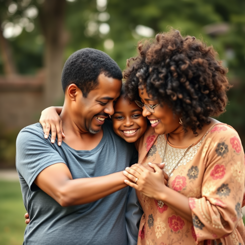 A magical scene centred on a mother and her young adult daughter, running towards each other with open arms, about to embrace in a loving hug. The daughter has a long, flowing braid, and both are dressed overalls. They face each other, with smiles of anticipation and love, ready to connect in the centre of a large Amazon forest clearing at dawn.