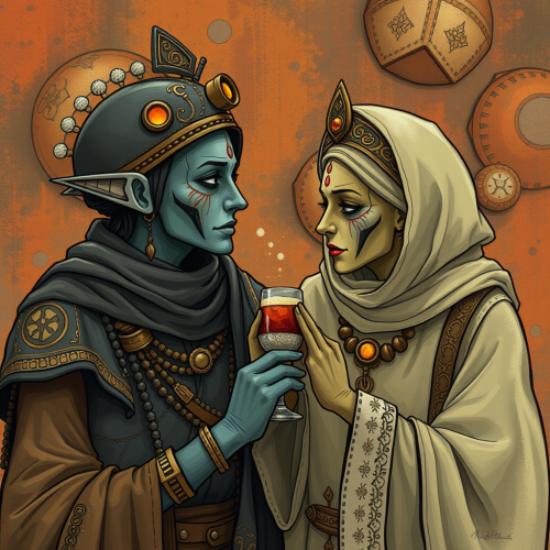 an elegant yet also cartoonish woman with red hair in pigtails, wearing a plain green dress and sitting next to an older woman mother. The figures are dressed in vintage fashions and are looking at the viewer. --v 6.0 --ar 9:7 --q .5 --c 11 --p si3d2b2 --sref 3032775322 26568
