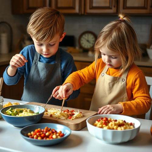 A mother and daughter standing behind a table, the daughter is 10 years old and the mother is 37 years old, and the mother is wearing a hijab and a religious covering and a chador, and the daughter is also wearing a hijab, and the mother is cooking and the daughter is decorating the food. And both of them are working with a smile on their face and the style of the photo is cartoon