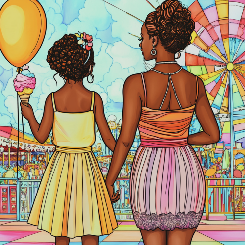create an image a beautiful African-American woman she is holding her daughters hand at a carnival. The woman has a balloon in the other hand. The daughter is holding an ice cream. The daughter is wearing a dress. The lines of the coloring outline are thick and so ideal for color drop painting.