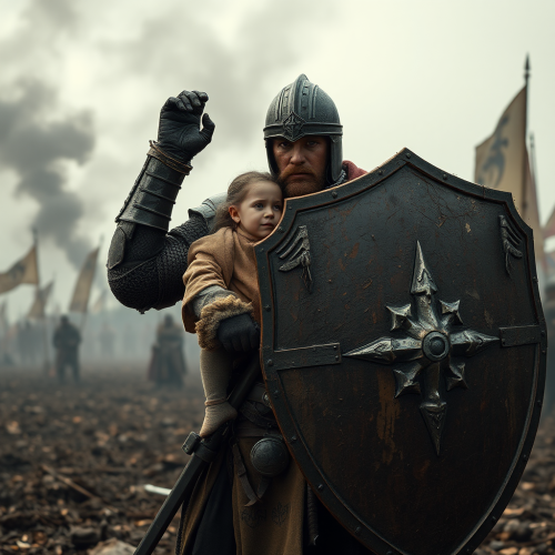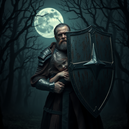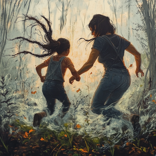 A scene centred on a mother and her young adult daughter, the image's focal point, running towards each other with open arms, about to embrace in a loving hug. The daughter has a long, flowing braid, and both are dressed in overalls. They are in a large clearing within the Amazon forest at dawn, with new silver shoots sprouting from the charred remains of burnt trees. The lush green forest begins to reclaim the burnt landscape, with a sense of enchantment and nature's resilience. Magic sparks around.