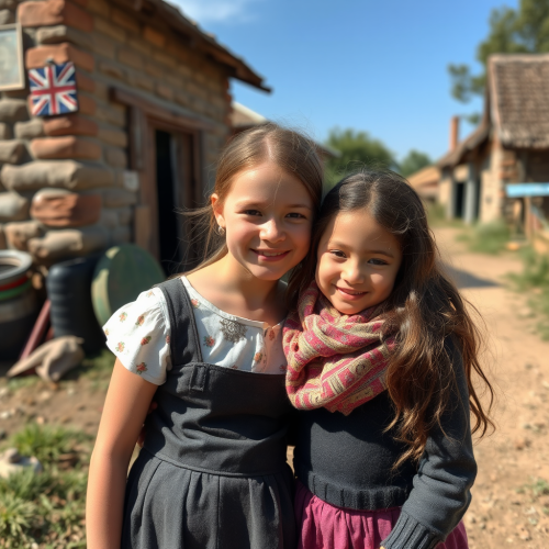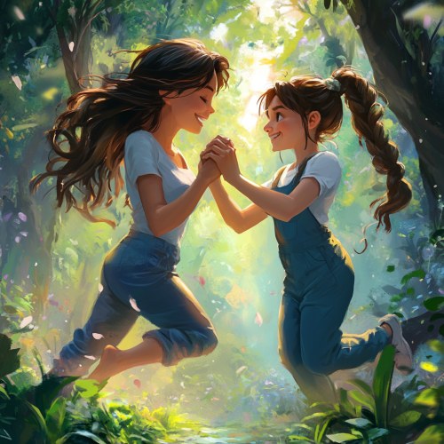 A magical scene centred on a mother and her young adult daughter, running towards each other with open arms, about to embrace in a loving hug. The daughter has a long, flowing braid, and both are dressed overalls. They face each other, with smiles of anticipation and love, ready to connect in the centre of a large Amazon forest clearing at dawn.