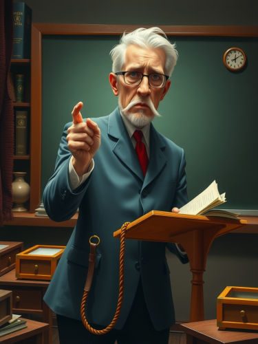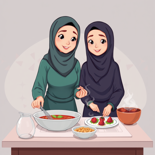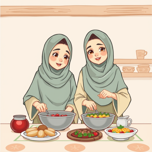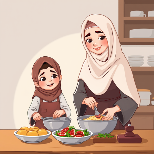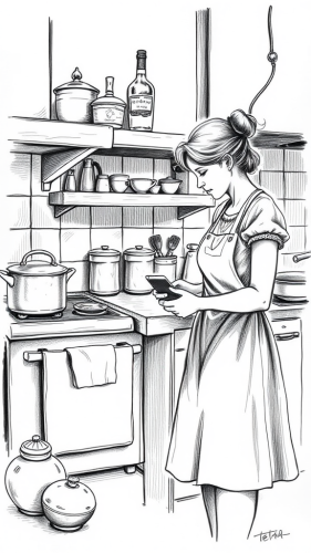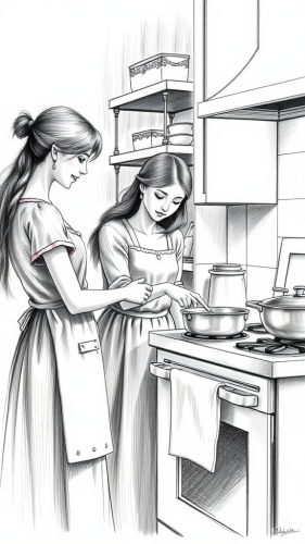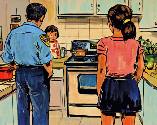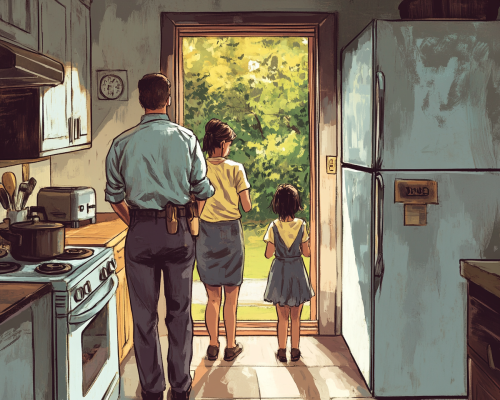 in the style of a new yorker cartoon. american kitchen in the morning. the mother cooking at the stove. her husband, a police officer, and her eight year old daughter, a school girl, are leaving out the back door. they turn their heads to the mom who just said something. --ar 5:4