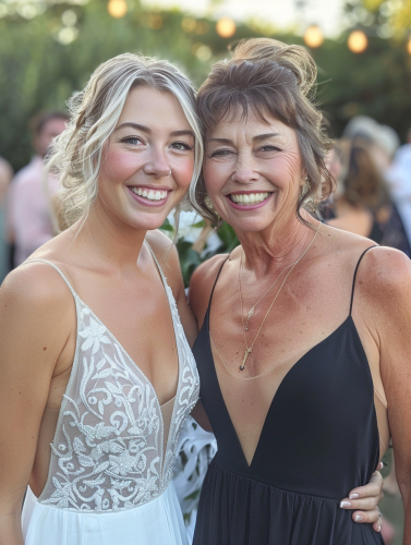 Very Realistic iPhone photo of a 25 year old lady who is getting married on her wedding day with her mom who is 60 years old. They are outside and both looking very happy smiling at the camera, the 60 year old mom is in a black dress and the 25 year old is in a white dress. --v 6.0 --ar 3:4