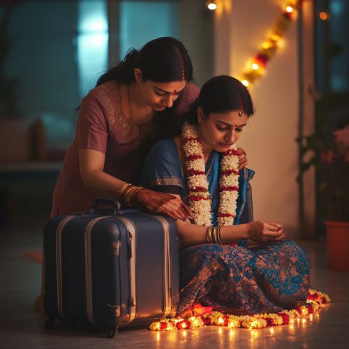 A photo of a 18 year old Indian daughter sitting on the floor, packing her suitcase. it is a normal, regular suitcase. Her mother stands behind her, placing a comforting hand on her shoulder, conveying a message of care and support. Both mother and daughter have natural Indian features, capturing a heartfelt moment of parting, filled with love and reassurance. Setup of a well lit festive home, with garlands of flowers and lights for a Diwali home.