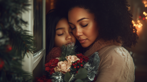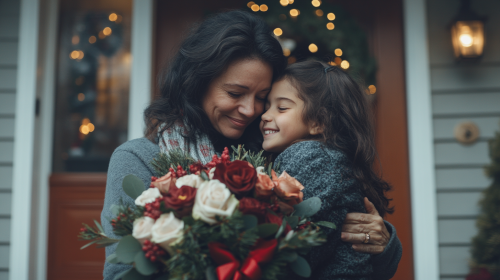 realistic photo of a frontal close-up of a 40-year-old Brazilian woman hugging her 15-year-old daughter, the woman holding a bouquet of flowers. In the background we see the door of their house decorated for Christmas, in the window we see Christmas lights and a Christmas pine tree. --ar 16:9