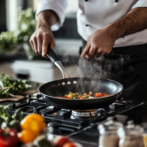 The chef cooks stove with frying pan in the kitchen. The cook prepares with the pan. Kitchen with stove in a modern kitchen. adult male cook holding pan standing in kitchen, preparing food