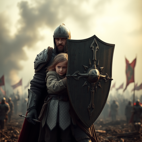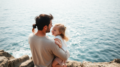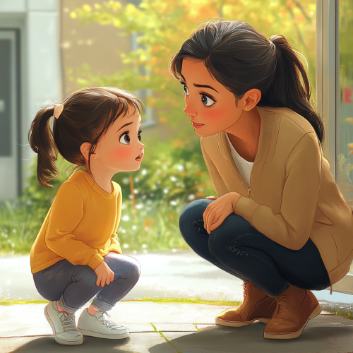 emotional realistic illustration, close up of a mother and 3 year old girl in front of the kindergarten, mom is crouching at her level and talking to her daughter, the girl is a bit upset, cinematic lightning