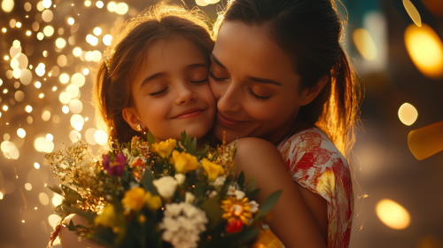 realistic photo of a frontal close-up of a 40-year-old Brazilian woman hugging her 15-year-old daughter, the woman holding a bouquet of flowers. they are happy and smiling wearing summer clothes. there are golden particles, as if they were Christmas sparkles that circulate around the mother and daughter, we see many flares of Christmas lights, the scene takes place at night, inside their house where it is all decorated for Christmas --ar 16:9