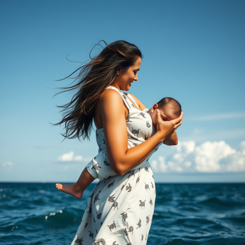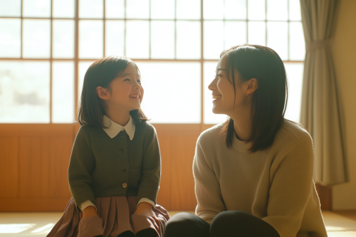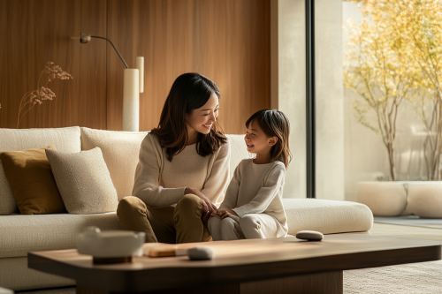 A young Japanese mother and her elementary school-aged daughter sit together in a modern Western-inspired room, featuring sleek furniture and neutral colors. The mother, in casual, elegant attire, smiles down at her daughter, who is wearing comfortable clothing. The room’s minimalist decor, clean lines, and contemporary style create a light and airy atmosphere, highlighting the family’s closeness. Photorealistic, realistic image, 8K resolution