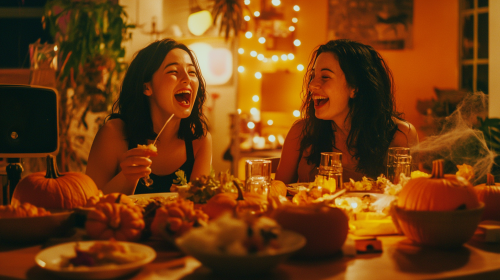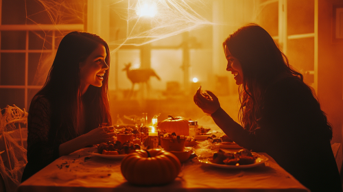 Movie still, documentary photography, editorial, in the style of Martin Parr: an off-centered shot of A mother and her daughter sitting at a table enjoying appetizers, listening to Halloween music on a speaker. They are surrounded by festive Halloween decorations, such as pumpkins and cobwebs. They look happy as they sing and dance. Cinematic orange halloween lighting, 35mm, intricate details --ar 16:9