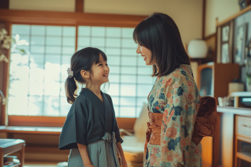 A young Japanese mother and her elementary school-aged daughter are seen together in a Western-inspired living room. The mother, dressed in a relaxed yet elegant outfit, has a caring expression as she interacts with her daughter, who stands beside her with a cheerful smile, dressed in casual attire. The modern, well-kept room reflects a sense of comfort and warmth, capturing a tender family moment. Photorealistic, realistic image, 8K resolution --ar 3:2 --v 6.1 --style raw