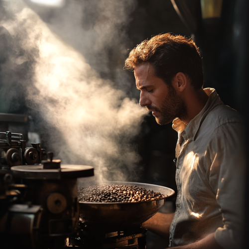 A realistic scene of a man smelling freshly roasted coffee beans, deeply inhaling the aroma during the roasting process. He stands near a coffee roaster with warm, rich lighting emphasizing the smoke and heat rising from the machine. The man's expression shows a deep appreciation for the coffee's aroma, with intricate details on the coffee roaster,
