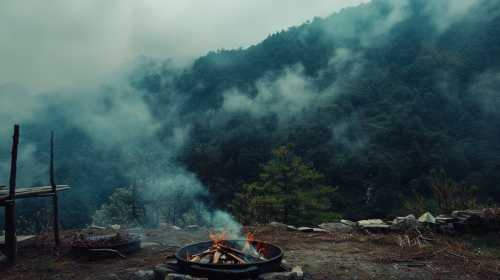 cinematic. day. pig roasting in open ground pit, southern style. Embers float in the air. Behind everything is a layer of fog blanketing a mountain side covered in forest. --ar 16:9