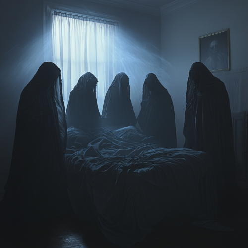 "A dimly lit room, veiled in darkness, with shadowy figures in dark robes standing silently around a bed. Their faces are obscured, and they make no movement or sound, adding an eerie stillness to the scene. The atmosphere is tense, like an encounter with spectral beings. Threads of fate weave invisibly around them, suggesting they may be there to pass judgment or reveal hidden truths. The setting is both haunting and tender, as thoughts of family--sons, a mother, and fleeting love--linger in the background. A feeling of unresolved fate and deeply buried secrets permeates the air, blending fear and peace under the soft glow of moonlight.