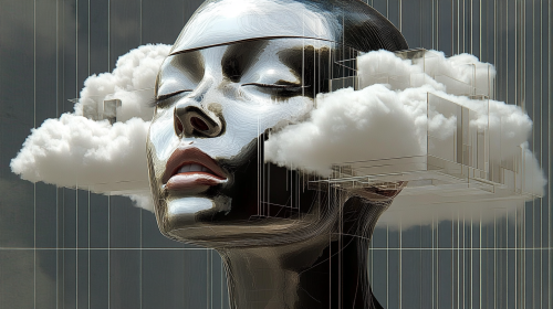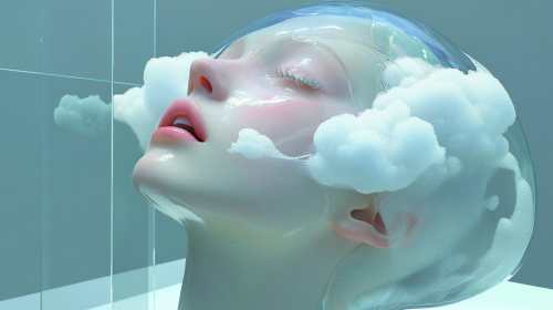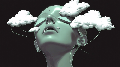 Surrealistic style, a woman's head is cut in half, with white clouds floating on the face and neck, obscuring her eyes and mouth, with simple shapes and lines, half-length portrait, iblack and green, the face is made up only of layered organic planes that appear to be floating above it, giving an illusionistic effect --ar 16:9 --sref 689229343 2534928772 20240730 --sw 500 --stylize 1000