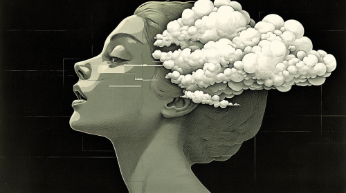 Surrealistic style, a woman's head is cut in half, with white clouds floating on the face and neck, obscuring her eyes and mouth, with simple shapes and lines, black and green, the face is made up only of layered organic planes that appear to be floating above it, giving an illusionistic effect --ar 16:9 --sref 689229343 3154438697 1271174748 --sw 500 --stylize 1000