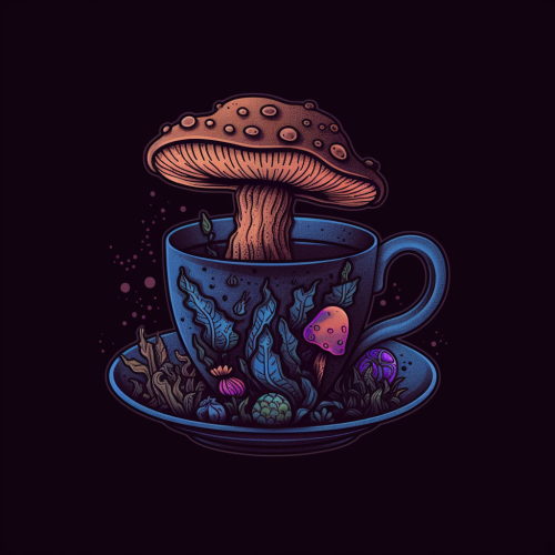 a logo for a company that sells adaptogen tea. a purple mushroom growing from a teapot psychadelic vibes, 1800's myseterious. black background --v 5.0