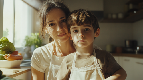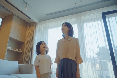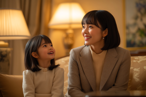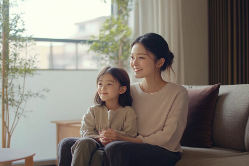 A young Japanese mother and her elementary school-aged daughter sit together in a modern Western-inspired room, featuring sleek furniture and neutral colors. The mother, in casual, elegant attire, smiles down at her daughter, who is wearing comfortable clothing. The room’s minimalist decor, clean lines, and contemporary style create a light and airy atmosphere, highlighting the family’s closeness. Photorealistic, realistic image, 8K resolution