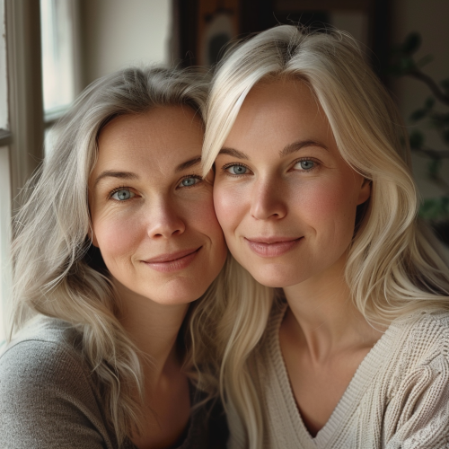 A hyper-realistic portrait of a mother and daughter with Nordic origins, the mother around 55 with light grey hair, soft wrinkles, fair skin, and warm blue eyes. The daughter, around 30, has light blonde hair, fair skin, and soft features. They are sitting closely, smiling warmly at the camera in a cozy indoor setting, with soft natural lighting streaming through the window, highlighting their Scandinavian features. hd quality, ultra-detailed faces, soft-focus background --ar 1:1 --v 6.0