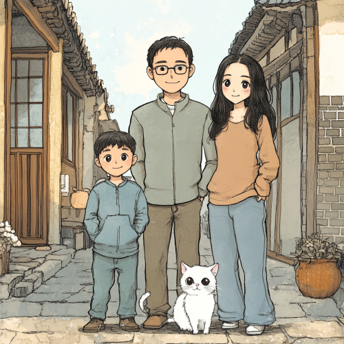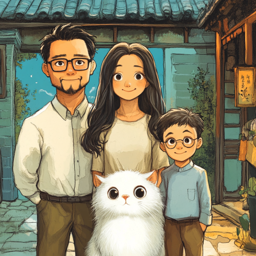 Create a comic showing a family of four in China: a young glasses-wearing father and a glasses-wearing long-haired mother standing in the back, a 10-year-old son standing on the left, and a 7-year-old daughter standing on the right. At their feet, there is a white long-haired cat.