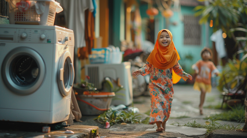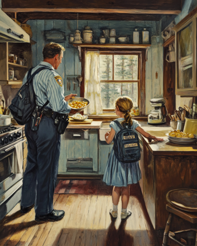 american kitchen in the morning. the mother is cooking eggs. her husband, a police officer, and her eight year old daughter are just about to leave out the back door. the girl is a student and has a school backpack. they are turning and looking at the mother who just said something. in the style of norman rockwell. --ar 4:5