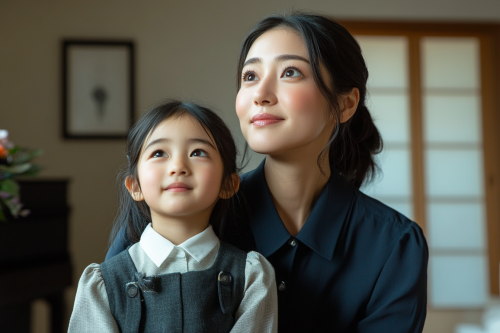 A young Japanese mother and her elementary school-aged daughter in an elegant, high-end Western-style room with minimalist and sophisticated decor. The mother is dressed in a stylish, tailored blouse and designer jeans, exuding a modern yet refined appearance. Her daughter, wearing a neatly pressed uniform with a subtle stylish touch, looks up with a warm smile. The room is furnished with high-quality, contemporary furniture, featuring clean lines and a luxurious feel that enhances the scene’s upscale family atmosphere. Photorealistic, realistic image, 8K resolution --ar 3:2 --v 6.1 --style raw