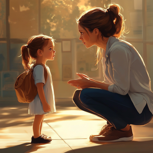emotional realistic illustration, close up of a mother and 3 year old girl in front of the kindergarten, mom is crouching at her level and talking to her daughter, the girl is a bit upset and thoughtful, backlight