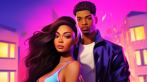 4k great quality, cover for Pinterest page, realistic Sims 4. Actor Woody Mcclain and Lala Anthony as the main characters. Popular African-American handsome Boys and beautiful Girls college students on the front cover. In soft but bold pink, purple, and blue background. --ar 16:9