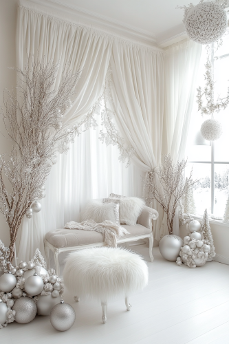 Create an image of a luxurious room draped in elegant white decorations, from sheer curtains to delicate snow-like ornaments. The space should radiate a sophisticated and serene white Christmas theme, with subtle silver accents. Aim for a clean and minimalist setup that emphasizes space and light. The decor should be captured with precision and clarity, showcasing the elegant details in a high-quality, realistic manner. This image should draw viewers in with its pure and peaceful ambiance, prompting them to seek more elegant Christmas decor ideas. Neat and organized. Camera: DSLR - Canon EOS 5D Mark IV. Lens: Canon EF 24-70mm f/2.8L II USM. Composition: Wide shot, room-centered, horizontal orientation, balance between furniture and space. Film: Digital, high resolution, color profile sRGB. Camera settings: ISO 400, f/2.8, 1/60 sec. --ar 2:3 --v 6.1 --s 250