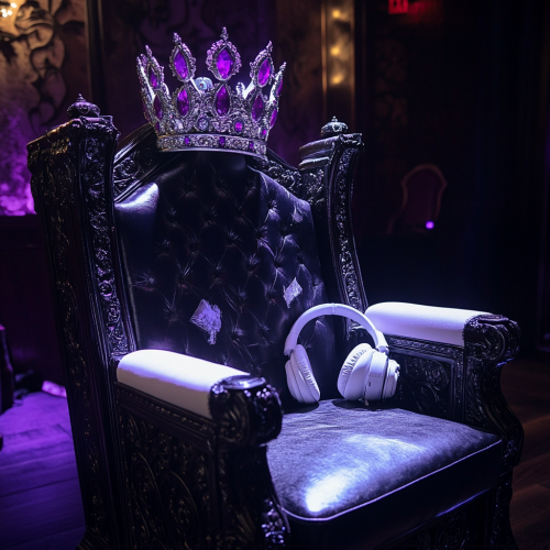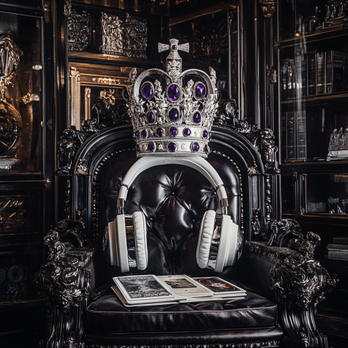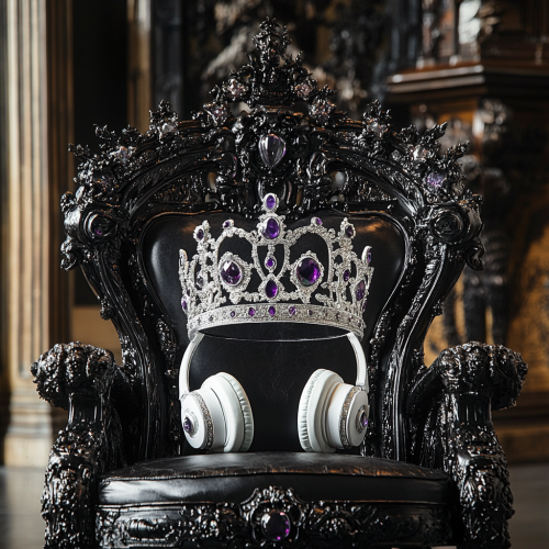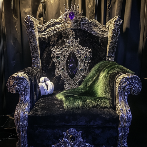 the location is a dark castle throne room, an up close view of the front of a large and tall throne chair, the large and tall throne chair is black and white with a dark wooden frame, on the the throne chair is a Silver King’s crown with amethyst, ruby, and howlite crystals embedded, and a pair of white headphones folding underneath the crown, and a tarot deck by the headphones