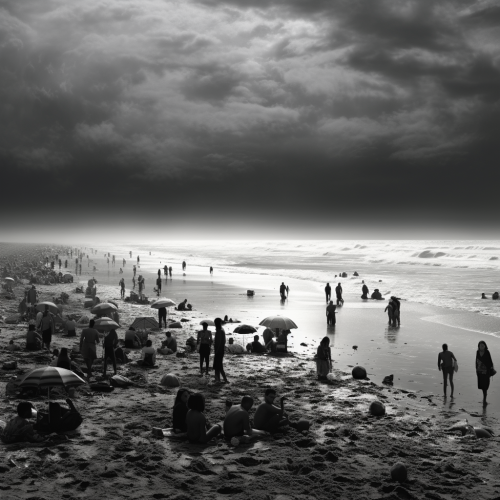 a photography in resolution 1800x500 of a beach, black and white, optimistic, by Annie Leibovitz, realistic.