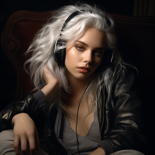 zoomed in close to eyes, photograph of a young beautiful supermodel woman, edgy and bohemian, with silver hair, listening to large headphones, with strong Caravaggio lighting, realistic photograph.