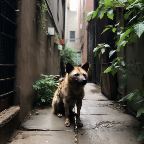 A symbiotic medieval Exquisite image with Sophie Scholl, Black Plague, hyena cub, medieval style, and a Urban view --v 6.0 --c 15 --ar 5:7 --s 750