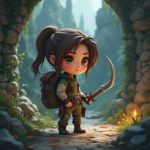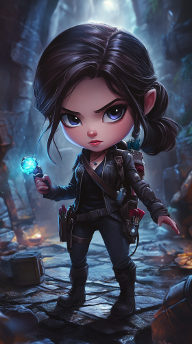 A chibi-style Lara Croft exploring ancient magical ruins and searching for powerful magical relics within the Hogwarts grounds. She’s dressed in adventure gear with magical artifacts and puzzles around her. High quality, 8k resolution. --ar 9:16