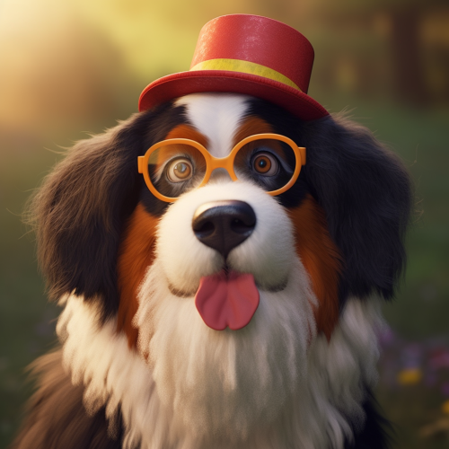 Bernese Mountain Dog, clown hat, clown makeup, black mens eyeglasses, clear lenses, long white beard, portrait, 3d character from Disney Pixar --ar 1:1 --v 5.0